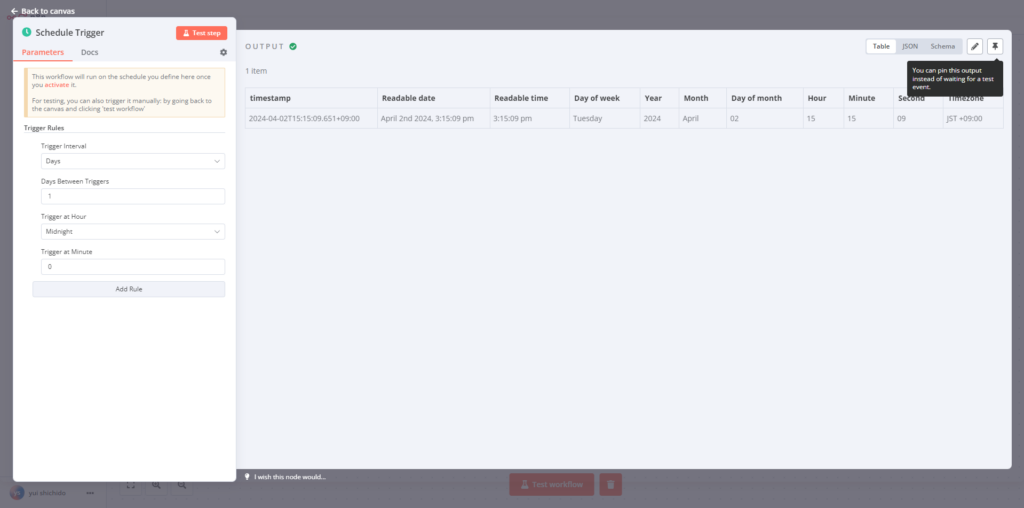 スケジューラートリガーを起動した後、ノードは、スケジューラートリガーの結果を持っています。